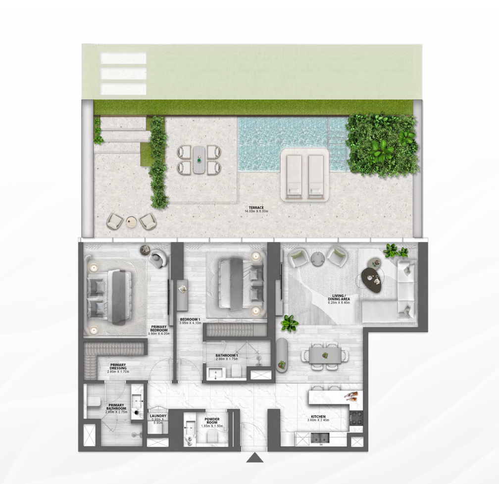 Created for residents prioritizing privacy and well-being, The Wellness Collection features 1–2 bedroom residences, each with a private garden and an integrated plunge pool. Homes open directly into the landscaped podium, allowing effortless access to greenery and beachfront pathways. With indoor–outdoor continuity and personal wellness zones, these residences function as intimate sanctuaries where relaxation begins at the doorstep.