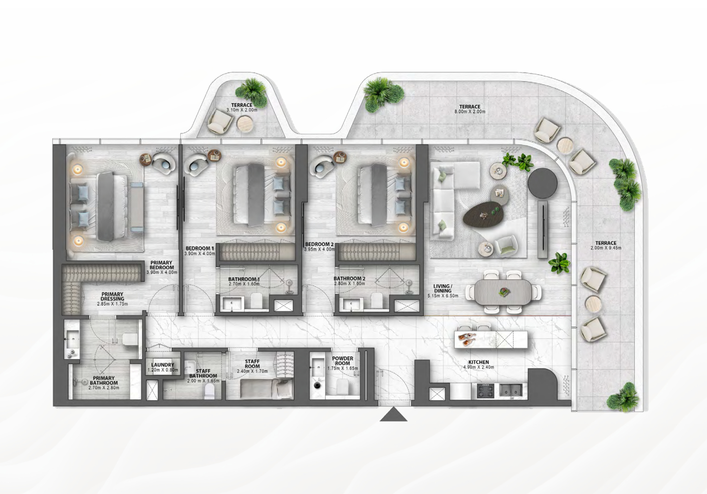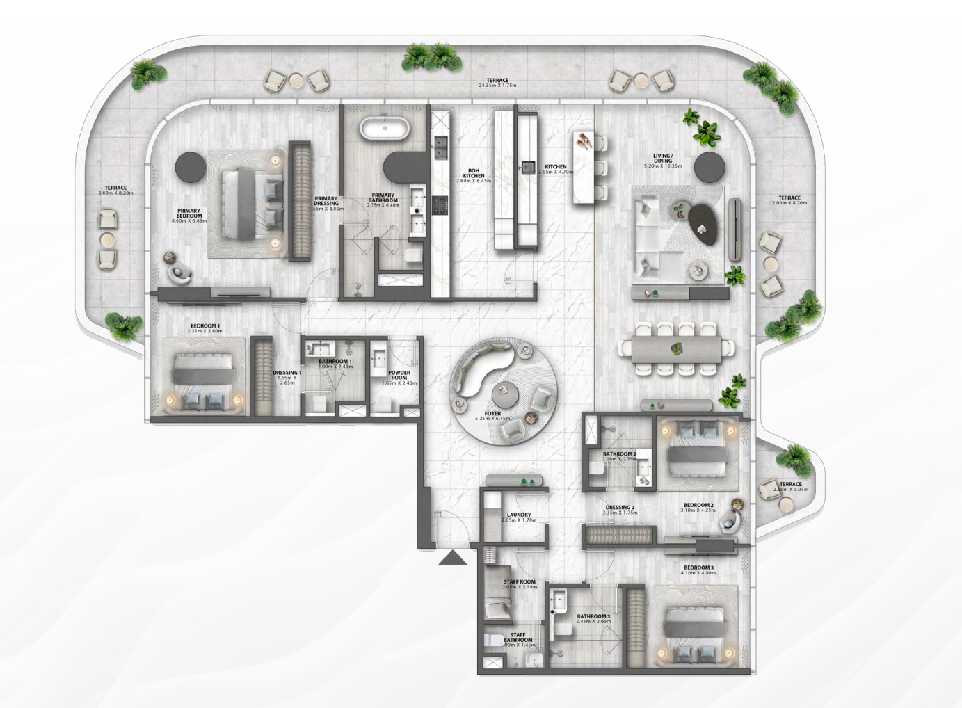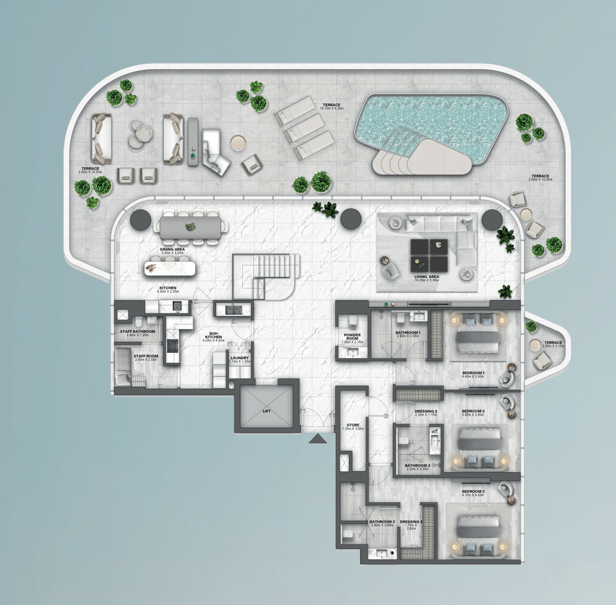 PASSO offers five penthouses, located on the highest floors and positioned at the tips of both towers for complete 180° exposure. These 4–5 bedroom homes deliver a vertical villa experience: double-height living areas, plunge pools, private lobbies, and dedicated enclosed parking with direct private elevator access. Terraces frame uninterrupted views of the sea, The Palm, and the Dubai skyline. The spatial choreography — from arrival to upper-level family lounges — is designed for elevated, elemental living.