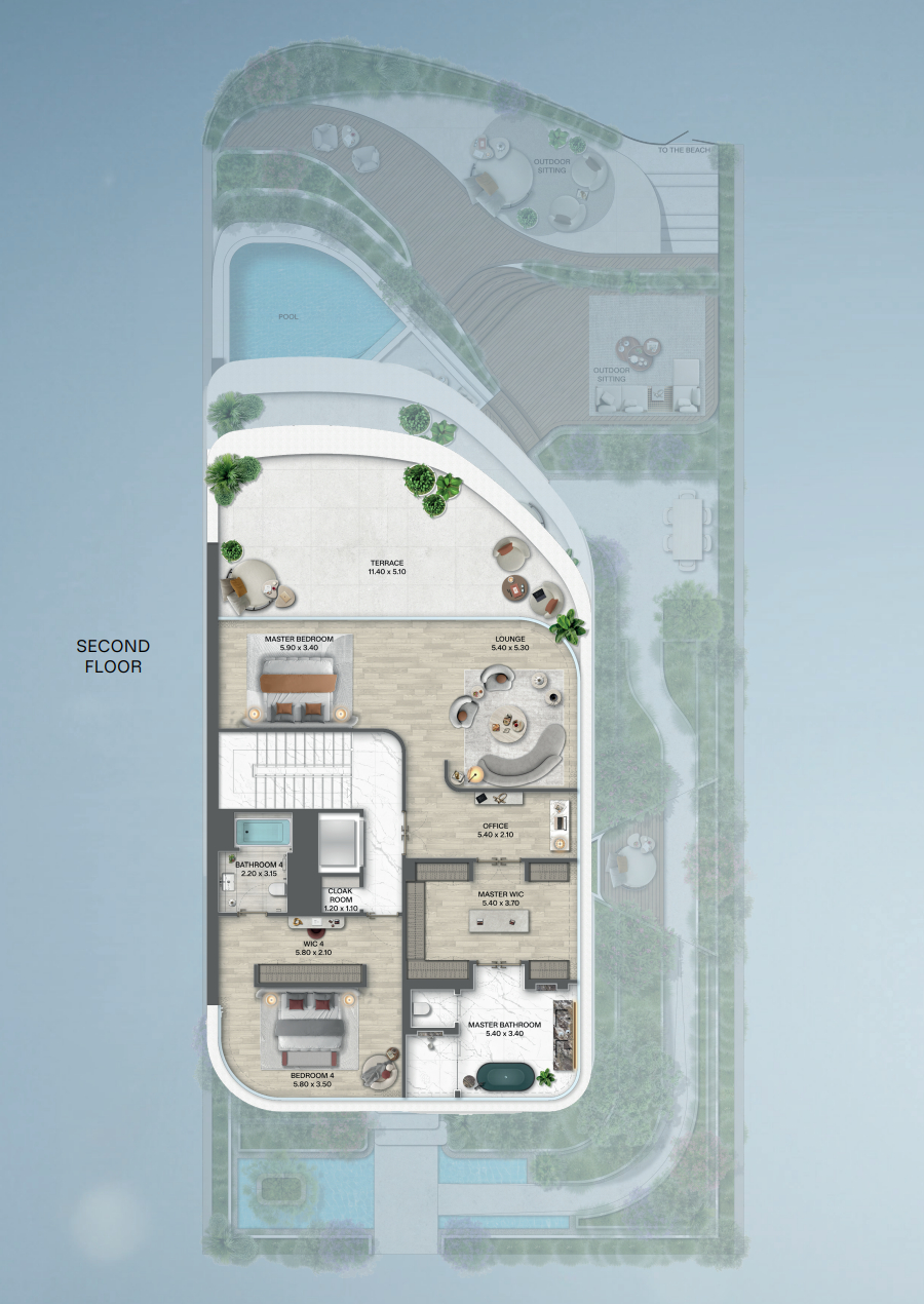 The six standalone 6-bedroom beach mansions draw inspiration from nautical architecture. Each residence features a private basement with 3-car enclosed parking, private arrival lobby, personal lift, feature staircase, and expansive multi-level indoor–outdoor living areas. Ground floors open into landscaped gardens with a yacht-inspired deck and plunge pool, blending directly into the beachfront terrain. Upper levels include panoramic terraces, show kitchens, family lounges, and master suites with private lounges and horizon-facing balconies.